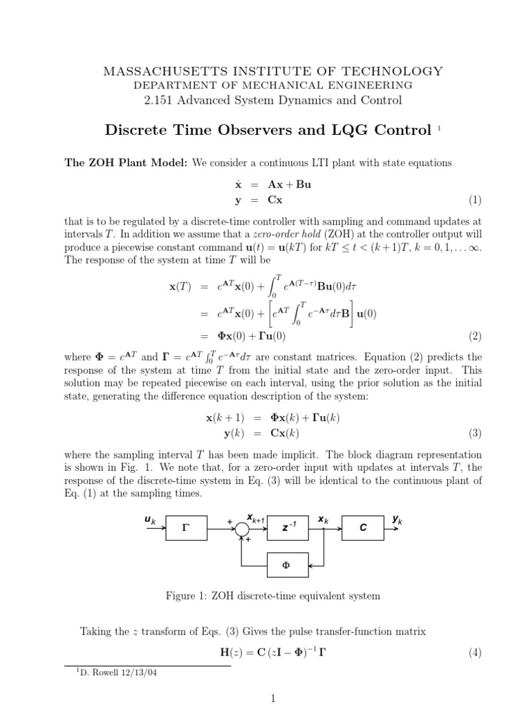 Discrete-Time Controller Design: The properties of controllability and observability transfer between the discrete and continuous representations. The discrete-time model may therefore be used to design controllers for a controllable system described by Eqs. (1). For example in a pole-placement regulator with control law u(n) = Kx(n) the closed-loop state equations will be x(n + 1) = ( K)x(n) (5) and the eigenvalues may be placed arbitrarily in the z-plane using the same techniques as for the continuous design. (Note that the eect of pole placement in the z-plane must be interpreted dierently from the s-plane). Discrete-Time Full Observer: The discrete-time model of Eqs. (3) may be used to generate an observer based controller for the continuous plant, with the assumption of zeroorder command. We assume that the system is observable, and that we desire estimates x(k) of the state x(k) based on observation of the output y alone. As in the case of the continuous observer, we use feedback of the estimator error y(k) C(k) as a correction x term x(k + 1|k) = (k|k 1) + u(k) + Ke [y(k) C(k|k 1)] x x (6) where Ke is the observer gain matrix, and the notation x(k + 1|k) denotes that the estimate (or prediction) of x(k + 1) is made using measurements available at time k. Dene the estimation error x as x = x x, (7) subtraction of Eq. (3) from Eq. (6) gives the error dierence equation: x(k + 1|k) = (k|k 1) Ke [y(k) C(k|k 1)] x x = [ Ke C] x(k|k 1)