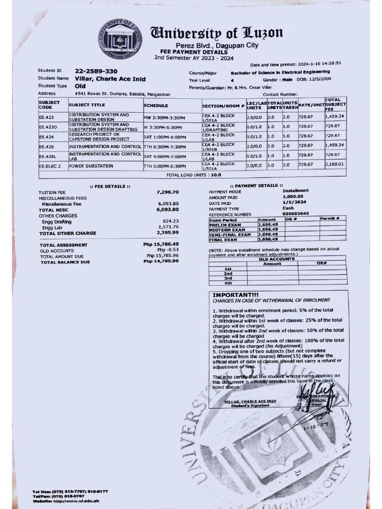 student Name Villar, Charle Ace Inid ‘Year Level 4 Gender : Male DOB: 12/5/2000
