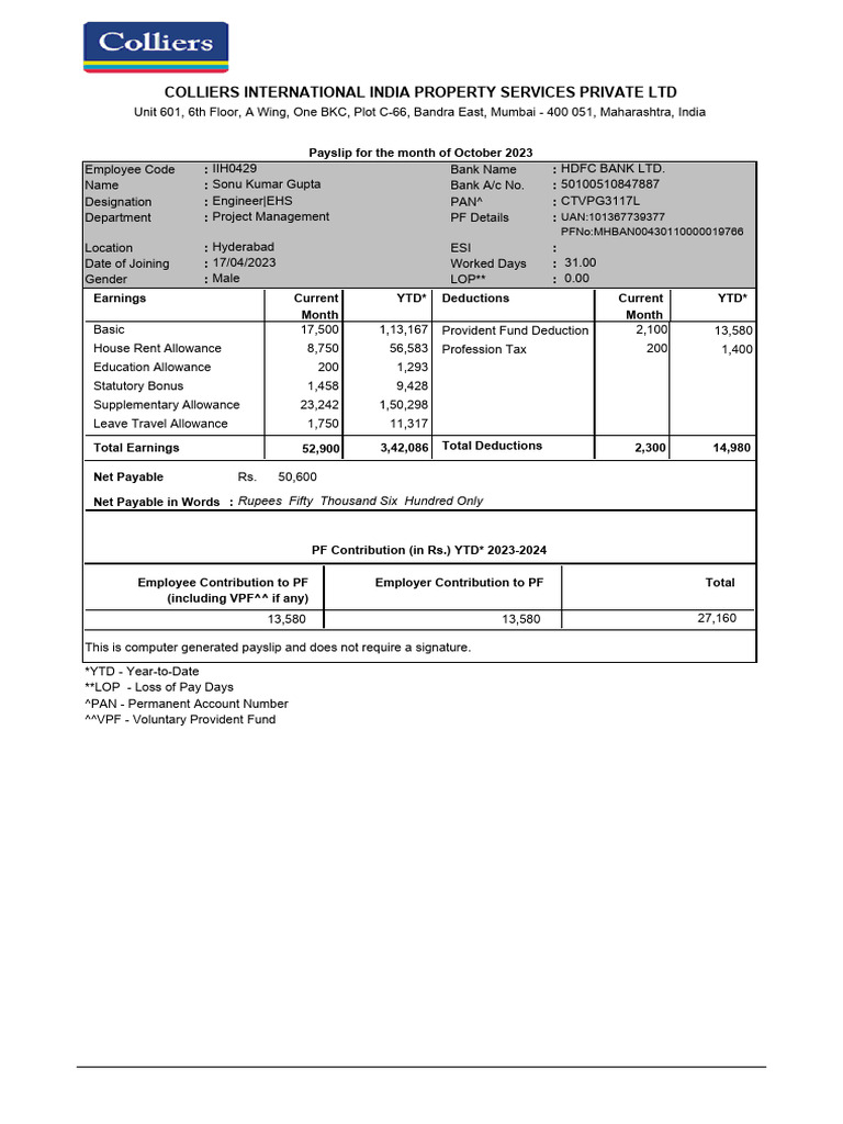 House Rent Allowance 8,750 56,583 Profession Tax 200 1,400