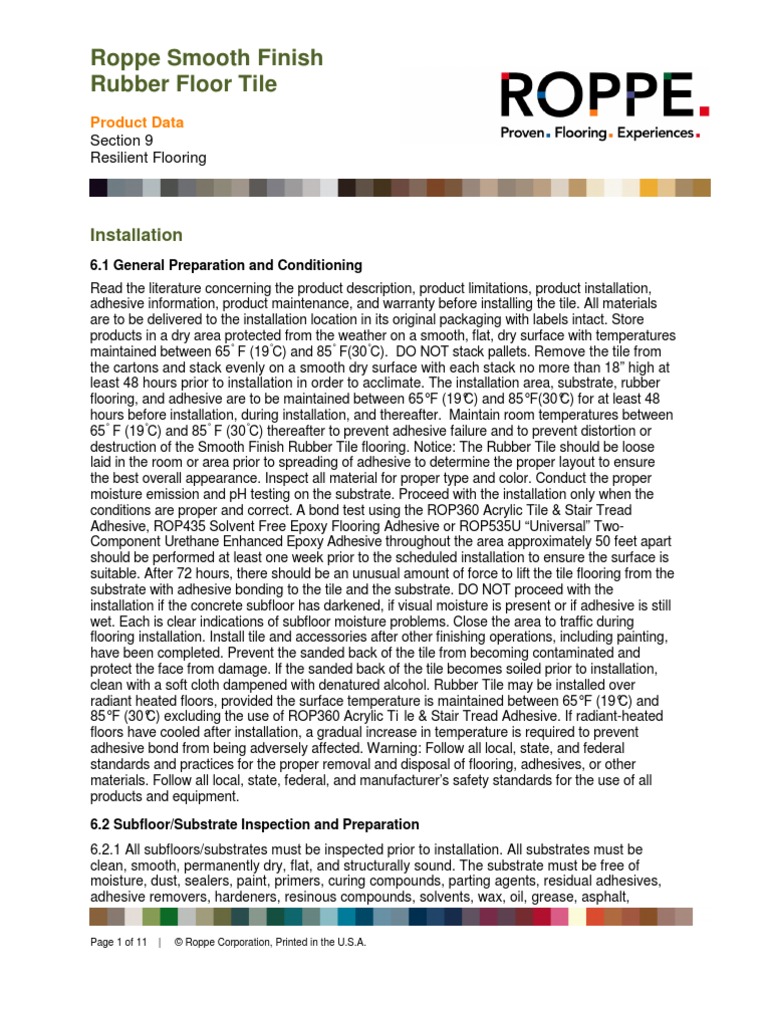 6.1 General Preparation and Conditioning Read the literature concerning the product description, product limitations, product installation, adhesive information, product maintenance, and warranty before installing the tile. All materials are to be delivered to the installation location in its original packaging with labels intact. Store products in a dry area protected from the weather on a smooth, flat, dry surface with temperatures maintained between 65 F (19C) and 85 F(30C). DO NOT stack pallets. Remove the tile from the cartons and stack evenly on a smooth dry surface with each stack no more than 18 high at least 48 hours prior to installation in order to acclimate. The installation area, substrate, rubber flooring, and adhesive are to be maintained between 65 F (19 and 85 F(30 for at least 48 C) C) hours before installation, during installation, and thereafter. Maintain room temperatures between 65 F (19C) and 85 F (30C) thereafter to prevent adhesive failure and to prevent distortion or destruction of the Smooth Finish Rubber Tile flooring. Notice: The Rubber Tile should be loose laid in the room or area prior to spreading of adhesive to determine the proper layout to ensure the best overall appearance. Inspect all material for proper type and color. Conduct the proper moisture emission and pH testing on the substrate. Proceed with the installation only when the conditions are proper and correct. A bond test using the ROP360 Acrylic Tile & Stair Tread Adhesive, ROP435 Solvent Free Epoxy Flooring Adhesive or ROP535U Universal TwoComponent Urethane Enhanced Epoxy Adhesive throughout the area approximately 50 feet apart should be performed at least one week prior to the scheduled installation to ensure the surface is suitable. After 72 hours, there should be an unusual amount of force to lift the tile flooring from the substrate with adhesive bonding to the tile and the substrate. DO NOT proceed with the installation if the concrete subfloor has darkened, if visual moisture is present or if adhesive is still wet. Each is clear indications of subfloor moisture problems. Close the area to traffic during flooring installation. Install tile and accessories after other finishing operations, including painting, have been completed. Prevent the sanded back of the tile from becoming contaminated and protect the face from damage. If the sanded back of the tile becomes soiled prior to installation, clean with a soft cloth dampened with denatured alcohol. Rubber Tile may be installed over radiant heated floors, provided the surface temperature is maintained between 65 F (19 and C) 85 F (30 excluding the use of ROP360 Acrylic Ti le & Stair Tread Adhesive. If radiant-heated C) floors have cooled after installation, a gradual increase in temperature is required to prevent adhesive bond from being adversely affected. Warning: Follow all local, state, and federal standards and practices for the proper removal and disposal of flooring, adhesives, or other materials. Follow all local, state, federal, and manufacturers safety standards for the use of all products and equipment. 6.2 Subfloor/Substrate Inspection and Preparation 6.2.1 All subfloors/substrates must be inspected prior to installation. All substrates must be clean, smooth, permanently dry, flat, and structurally sound. The substrate must be free of moisture, dust, sealers, paint, primers, curing compounds, parting agents, residual adhesives, adhesive removers, hardeners, resinous compounds, solvents, wax, oil, grease, asphalt,
