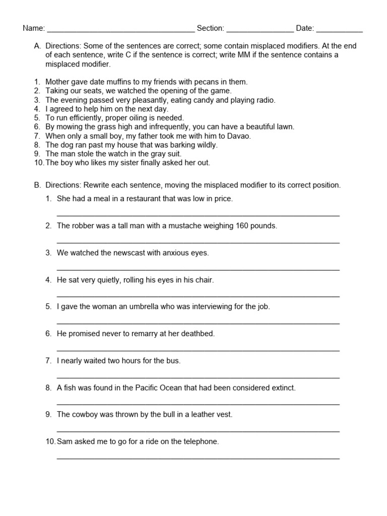 B. Directions: Rewrite each sentence, moving the misplaced modifier to its correct position.