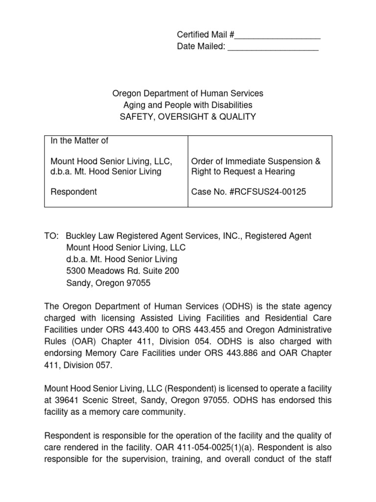 Certified Mail #__________________ Date Mailed: ___________________ Oregon Department of Human Services Aging and People with Disabilities SAFETY, OVERSIGHT & QUALITY In the Matter of Mount Hood Senior Living, LLC, d.b.a. Mt. Hood Senior Living Respondent Order of Immediate Suspension & Right to Request a Hearing Case No. #RCFSUS24-00125 TO: Buckley Law Registered Agent Services, INC., Registered Agent