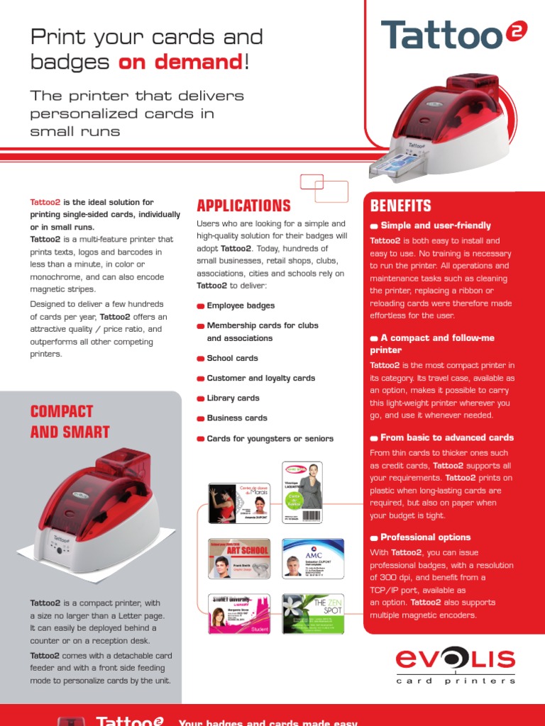 2010 Evolis Card Printer. All right reserved. Actual data may differ. Data, specifications and product picture may be updated without prior notification. All brands and trademarks belong to their respective holders. 04/2010. Photos by Calvez Actinic. KB-TTO2-54US-A