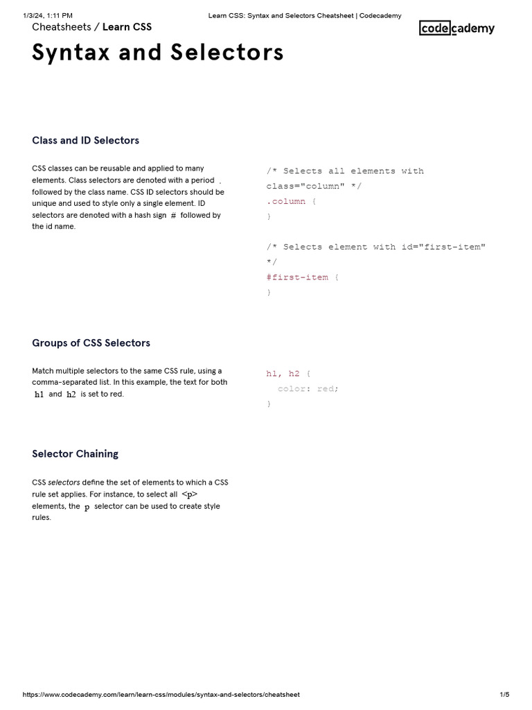 1/3/24, 1:11 PM Learn CSS: Syntax and Selectors Cheatsheet | Codecademy