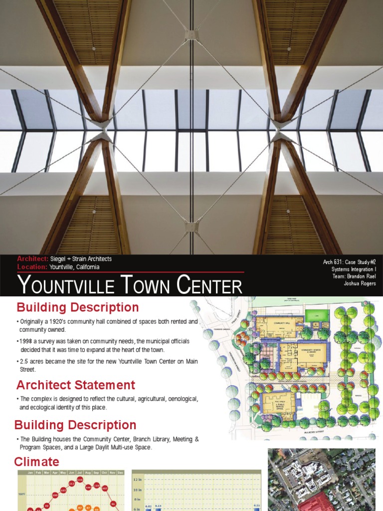 Entire community involvement created slow moving master planning process beginning in 1998, construction did not began until 2008. Contextual Located in the heart of Yountville, California Wanted a place where residents could meet, learn, plan, and celebrate Formation of new town square for the city Intentions Addition of Sheriffs substation on the site Roof utilizes The new buildings must house a branch library, multi-purpose room, teen center, meeting rooms, and other program spaces Sustainability LEED Platinum Rating The building utilizes a ground source heating and cooling system, a 38 kw photovoltaic array, low-flow plumbing fixtures, environmentally preferred building materials, efficient lighting and daylighting, natural ventilation, water-conserving landscape, and an innovative subsurface irrigation system.