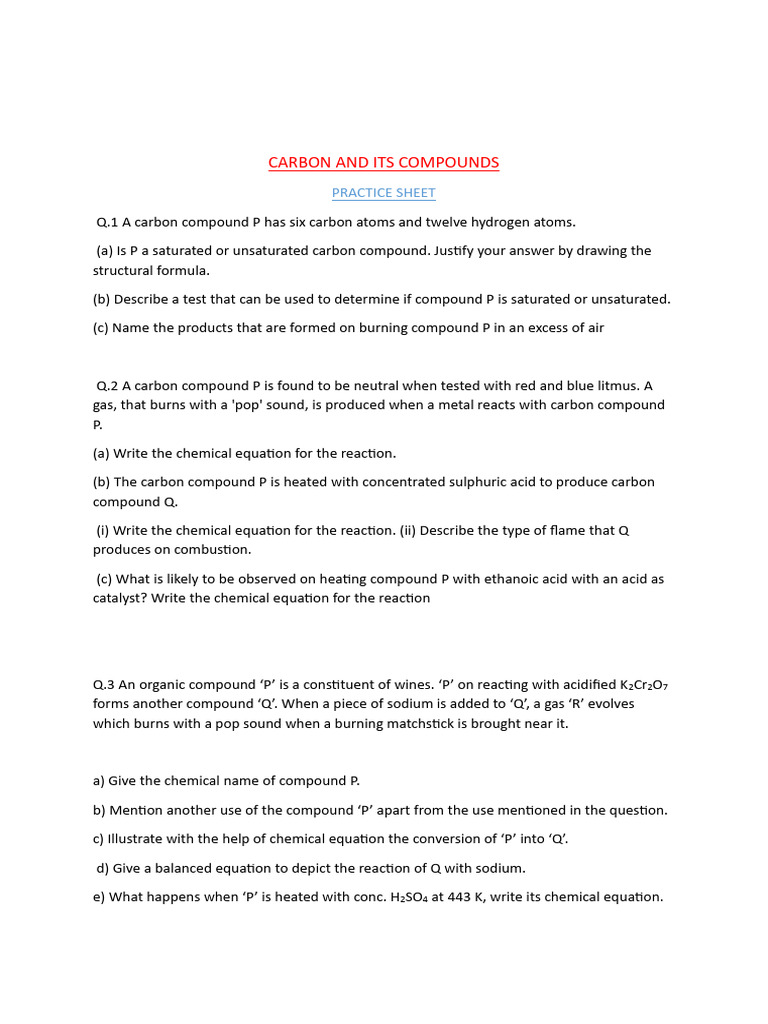 Q.1 A carbon compound P has six carbon atoms and twelve hydrogen atoms.