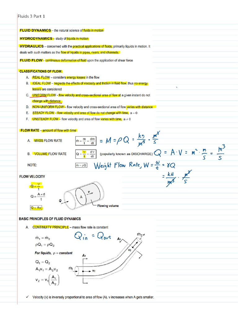 Fluid Dynamics Principles: Introduces the core concepts and principles of fluid dynamics, including key formulas and definitions such as Bernoulli's Principle and continuity equation. Problem Solving with Situations: Focuses on resolving numerous complex situations in fluid dynamics using given data, real-world scenarios, and various measurement techniques. Fluids 3 Part 1