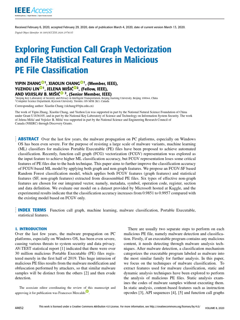 INDEX TERMS Function call graph, machine learning, malware classification, Portable Executable,