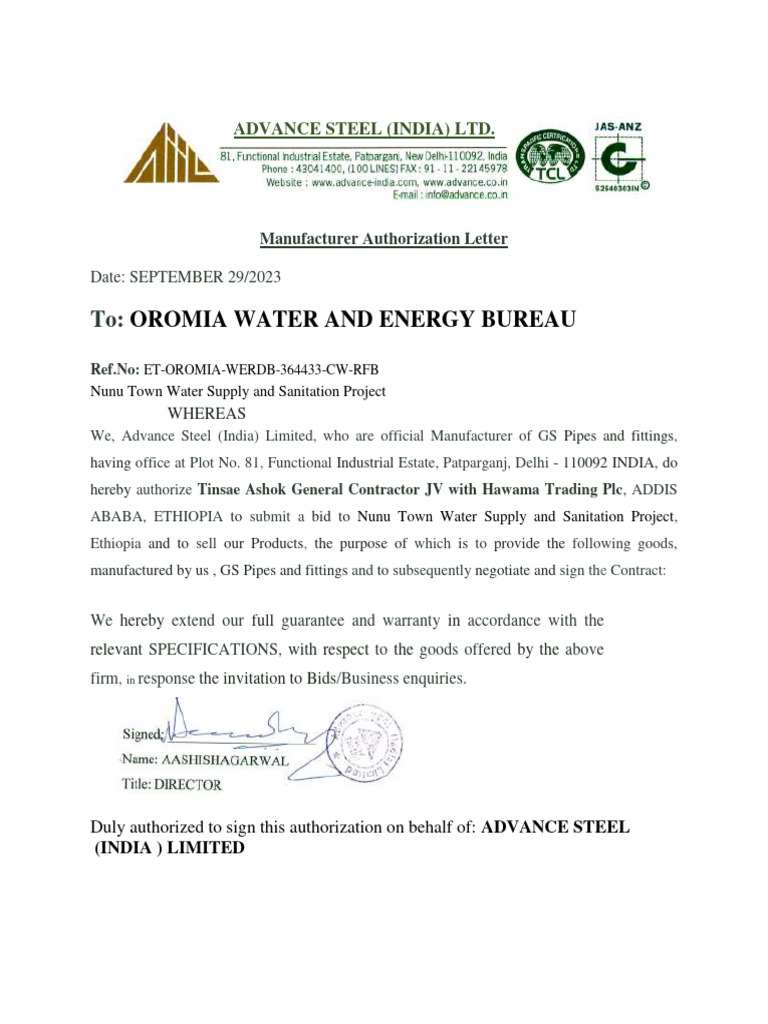 hereby authorize Tinsae Ashok General Contractor JV with Hawama Trading Plc, ADDIS
