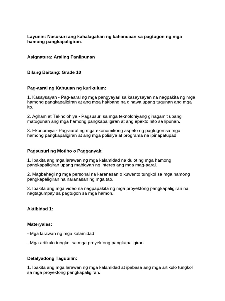 Layunin: Nasusuri ang kahalagahan ng kahandaan sa pagtugon ng mga