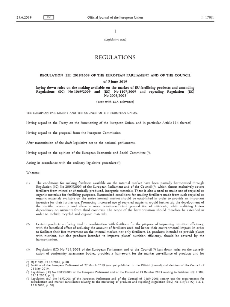 on the market of EU fertilising products and amending Regulations (EC) No 1069/2009 and (EC) No 1107/2009 and repealing