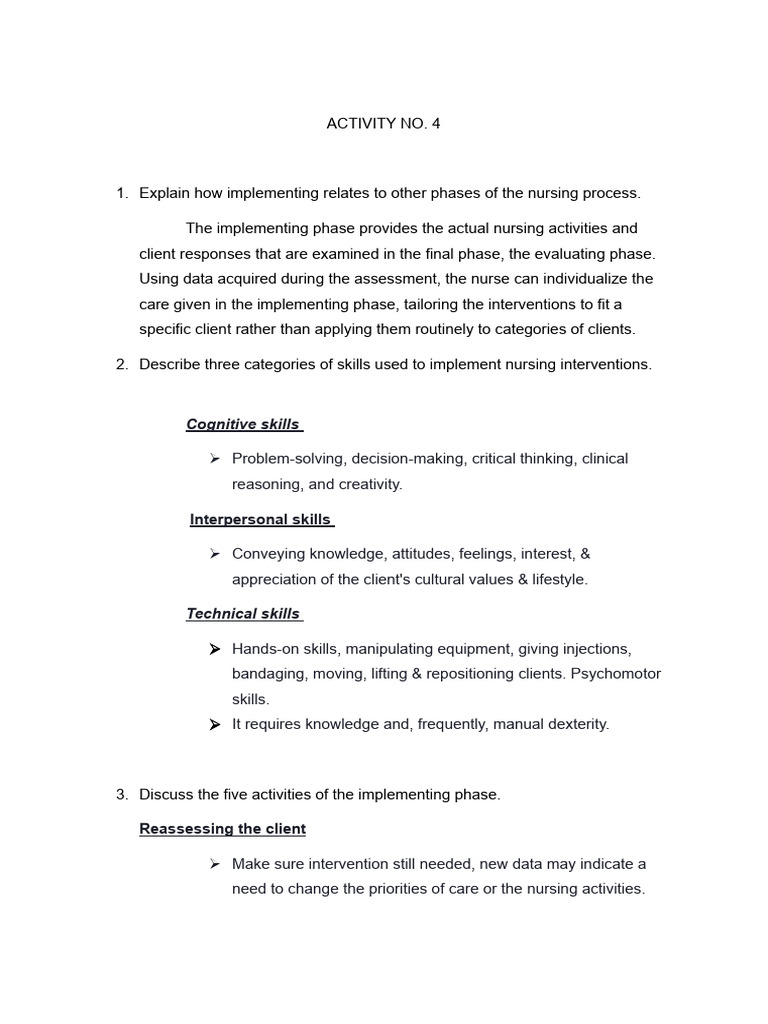 1. Explain how implementing relates to other phases of the nursing process.
