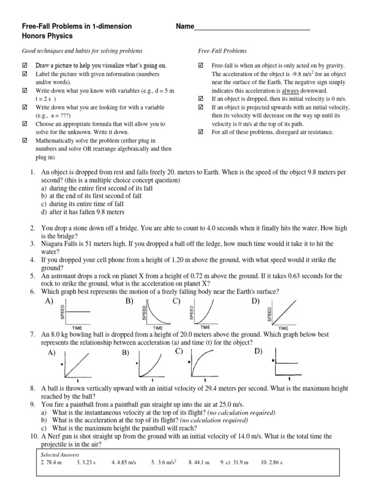 1. An object is dropped from rest and falls freely 20. meters to Earth. When is the speed of the object 9.8 meters per