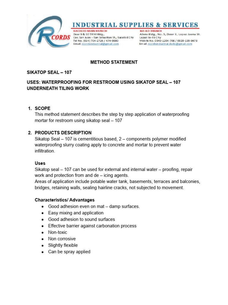 USES: WATERPROOFING FOR RESTROOM USING SIKATOP SEAL – 107
