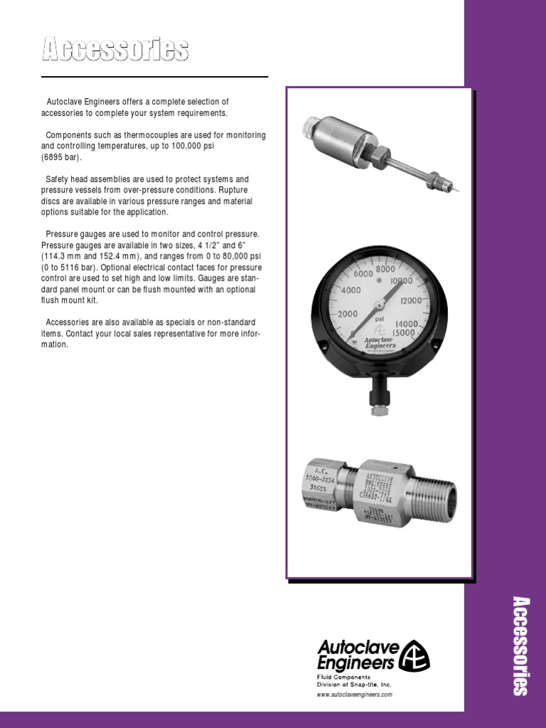 Autoclave Engineers offers a complete selection of accessories to complete your system requirements. Components such as thermocouples are used for monitoring and controlling temperatures, up to 100,000 psi (6895 bar). Safety head assemblies are used to protect systems and pressure vessels from over-pressure conditions. Rupture discs are available in various pressure ranges and material options suitable for the application. Pressure gauges are used to monitor and control pressure. Pressure gauges are available in two sizes, 4 1/2 and 6 (114.3 mm and 152.4 mm), and ranges from 0 to 80,000 psi (0 to 5116 bar). Optional electrical contact faces for pressure control are used to set high and low limits. Gauges are standard panel mount or can be ush mounted with an optional ush mount kit. Accessories are also available as specials or non-standard items. Contact your local sales representative for more information.