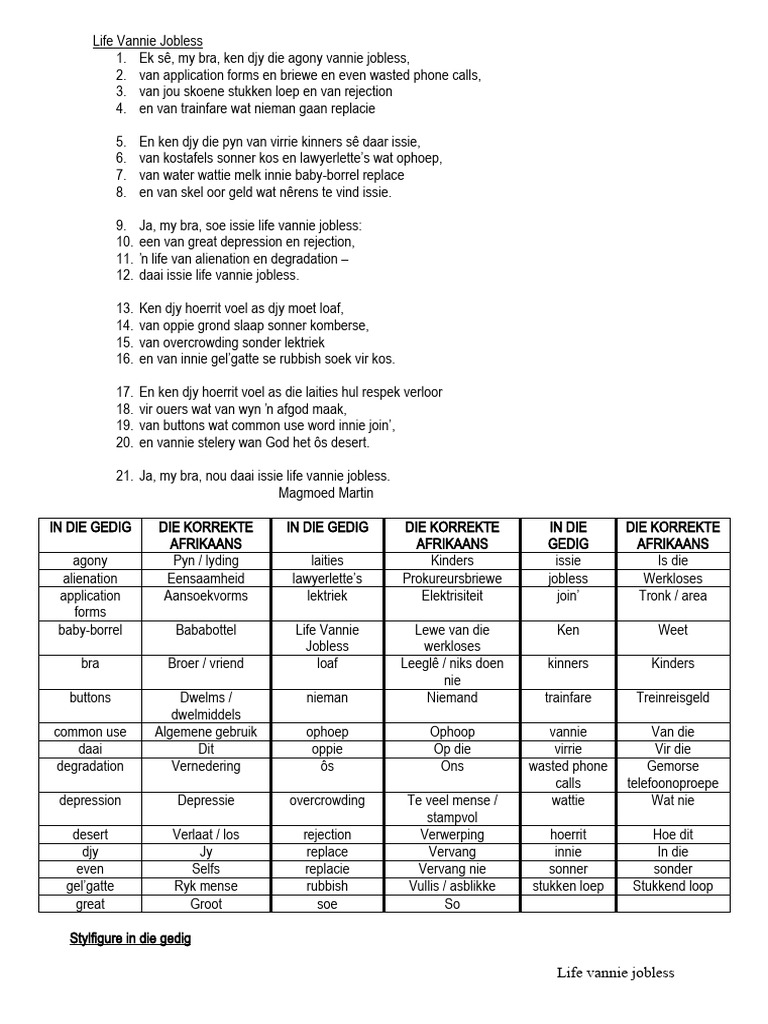 jobless” “Ja, my bra, nou daai issie life vannie jobless” – Dit beklemtoon hoe erg dit is om sonder ‘n werk te wees.