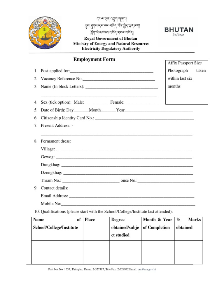 Post box No. 1557; Thimphu, Phone: 2-327317; Tele Fax: 2-329952 Email: era@era.gov.bt