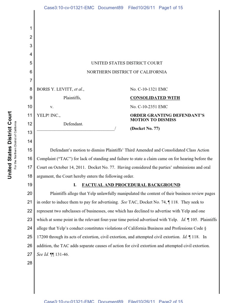 ,Plaintiffs,v.YELP! INC.,Defendant. ___________________________________/ No. C-10-1321 EMC