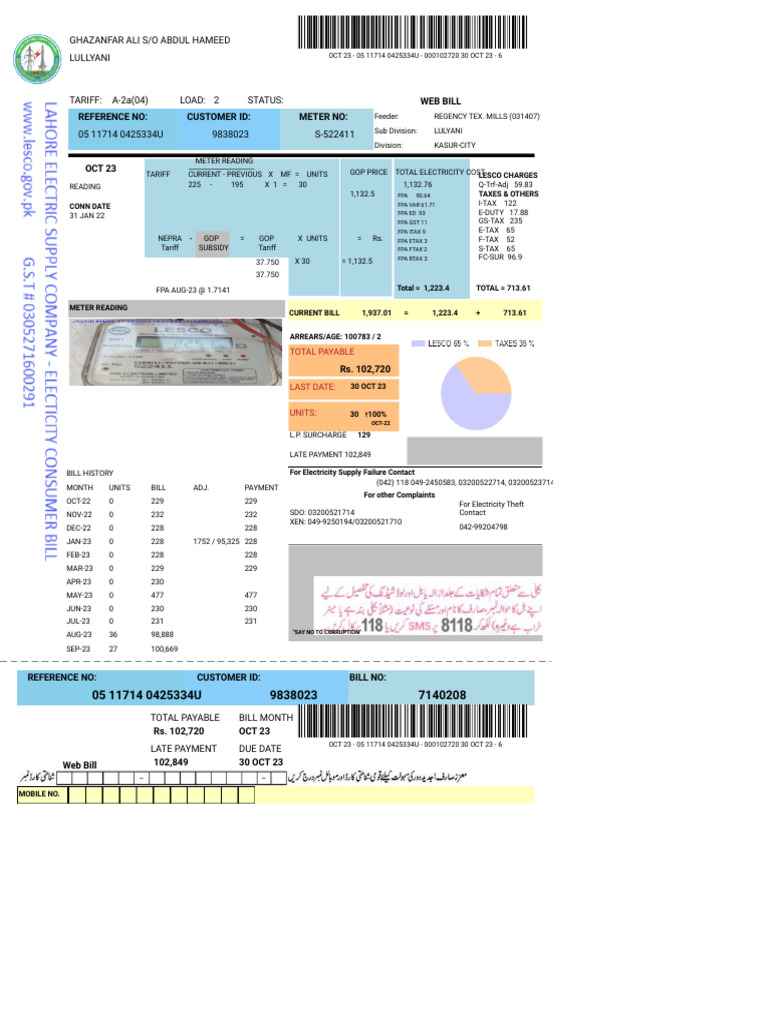OCT 23 TARIFF CURRENT - PREVIOUS X MF = UNITS GOP PRICE TOTAL ELECTRICITY COST