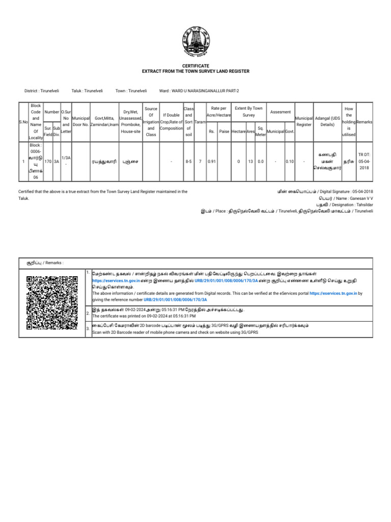 Certified that the above is a true extract from the Town Survey Land Register maintained in the மின் கையொப்பம் / Digital Signature : 05-04-2018