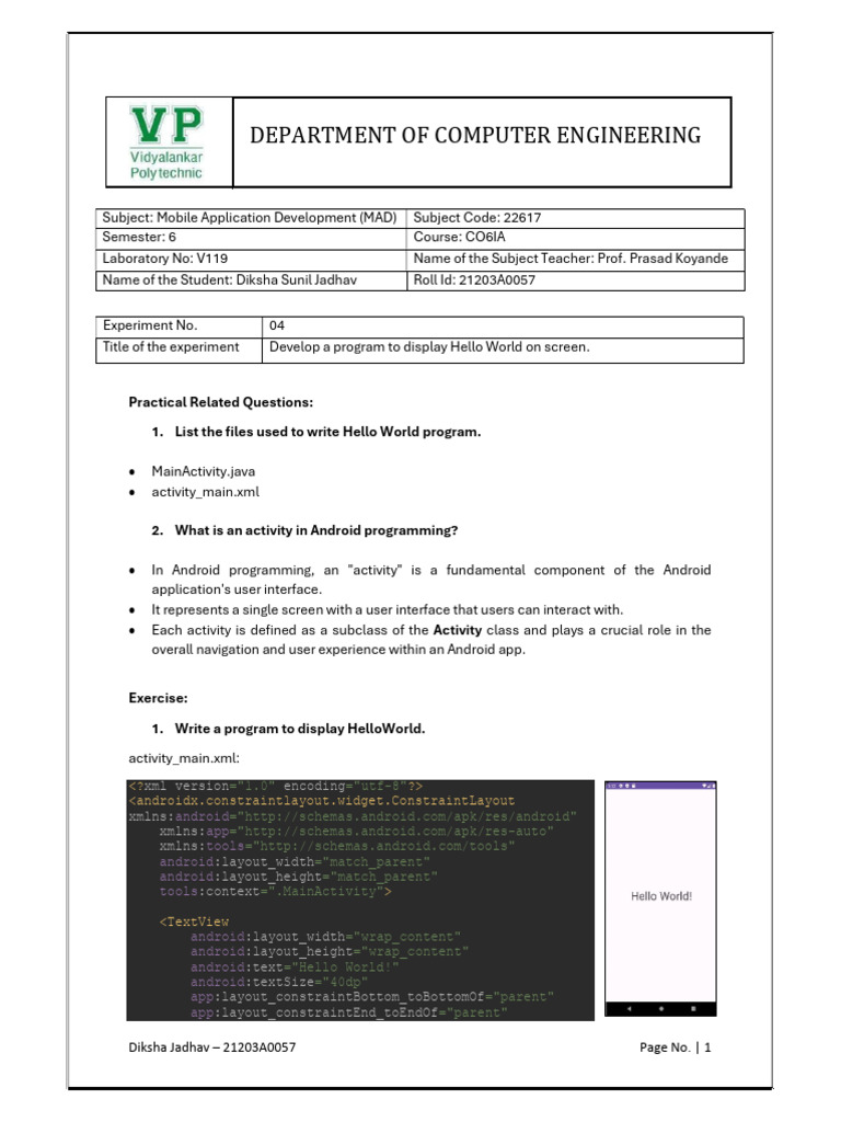 Subject: Mobile Application Development (MAD) Subject Code: 22617