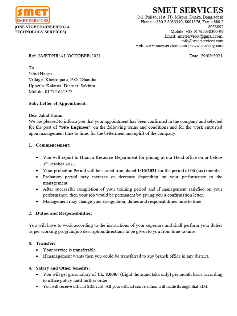 Sub: Letter of Appointment.