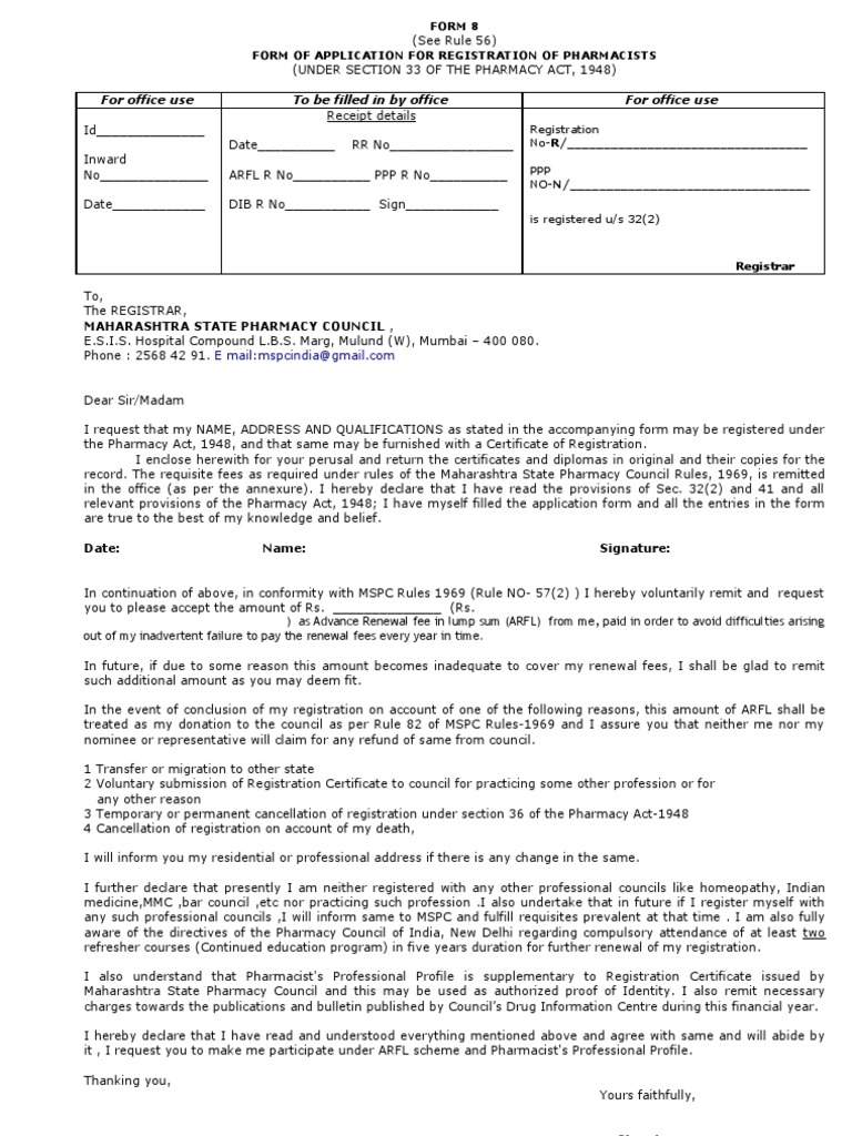 To, The REGISTRAR, MAHARASHTRA STATE PHARMACY COUNCIL , E.S.I.S. Hospital Compound L.B.S. Marg, Mulund (W), Mumbai 400 080. Phone : 2568 42 91. E mail:mspcindia@gmail.com Dear Sir/Madam I request that my NAME, ADDRESS AND QUALIFICATIONS as stated in the accompanying form may be registered under the Pharmacy Act, 1948, and that same may be furnished with a Certificate of Registration. I enclose herewith for your perusal and return the certificates and diplomas in original and their copies for the record. The requisite fees as required under rules of the Maharashtra State Pharmacy Council Rules, 1969, is remitted in the office (as per the annexure). I hereby declare that I have read the provisions of Sec. 32(2) and 41 and all relevant provisions of the Pharmacy Act, 1948; I have myself filled the application form and all the entries in the form are true to the best of my knowledge and belief. Date: Name: Signature: