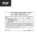 Application form duly filled in by the APPLICANT in his neat legible hand. 2. Application form duly filled in by the APPLICANT in his neat legible hand. Four recent, passport size, front pose identical Photographs (3.5cmx4.5cm) One of those may be used for identity slip. 3. Final year Mark list of B. Pharm in Original and one photo copy of the same. 4. Degree certificate in original and one photo copy of the same. 5. S.S.C. passing certificate and Pharmacy College Leaving Certificate in original and photo copy of the same. 6. Copy of the proof of the residence in Maharashtra State (ration card/domicile certificate/election card duly attested.) 7. Identity slip attested by Principal/ Gazetted Officer/Officer of Equivalent rank of this State.