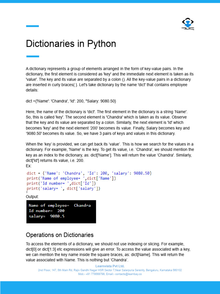 key as an index to the dictionary, as: dict['Name’]. This will return the value ‘Chandra'. Similarly,