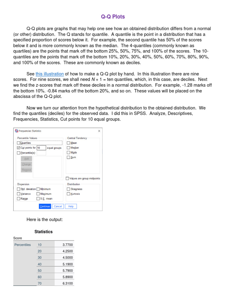 Q-Q plots are graphs that may help one see how an obtained distribution differs from a normal