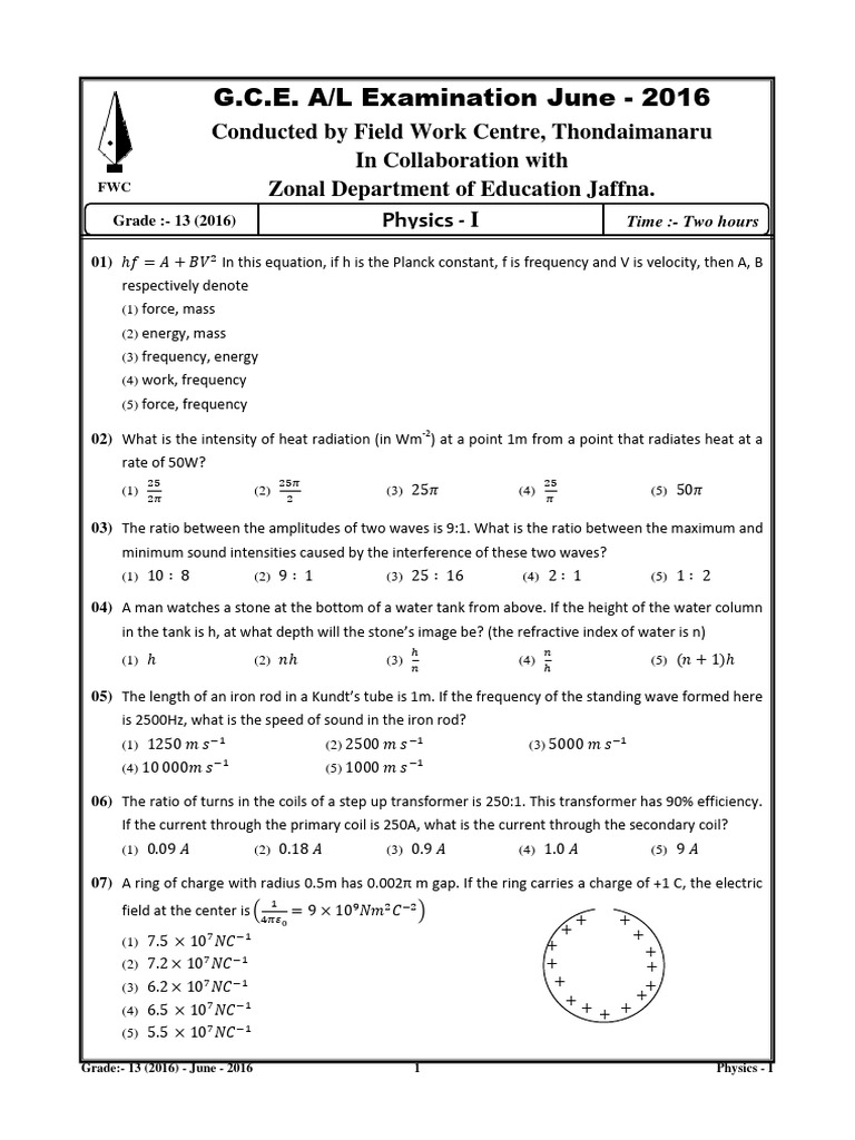 Grade:- 13 (2016) - June - 2016 9 Physics - I