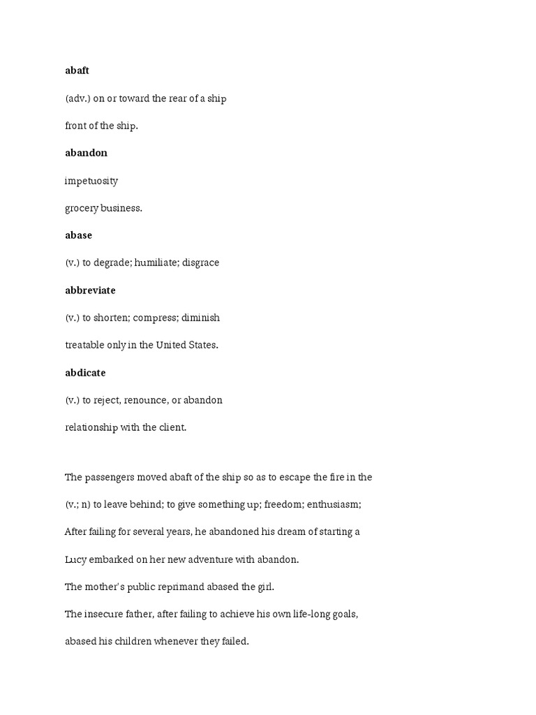 The passengers moved abaft of the ship so as to escape the fire in the (v.; n) to leave behind; to give something up; freedom; enthusiasm; After failing for several years, he abandoned his dream of starting a Lucy embarked on her new adventure with abandon. The mother's public reprimand abased the girl. The insecure father, after failing to achieve his own life-long goals, abased his children whenever they failed.