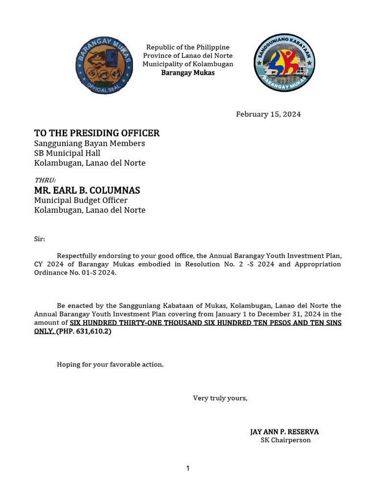 Respectfully endorsing to your good office, the Annual Barangay Youth Investment Plan,