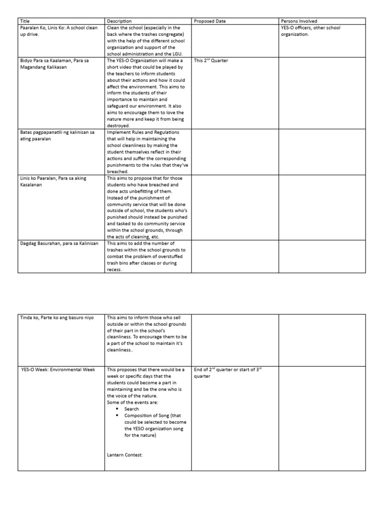 YES-O Week: Environmental Week This proposes that there would be a End of 2nd quarter or start of 3rd