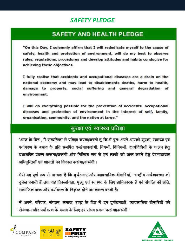 Safety and Health Pledge: Contains a bilingual safety and health pledge emphasizing the commitment to safety, health regulations, and environmental protection.