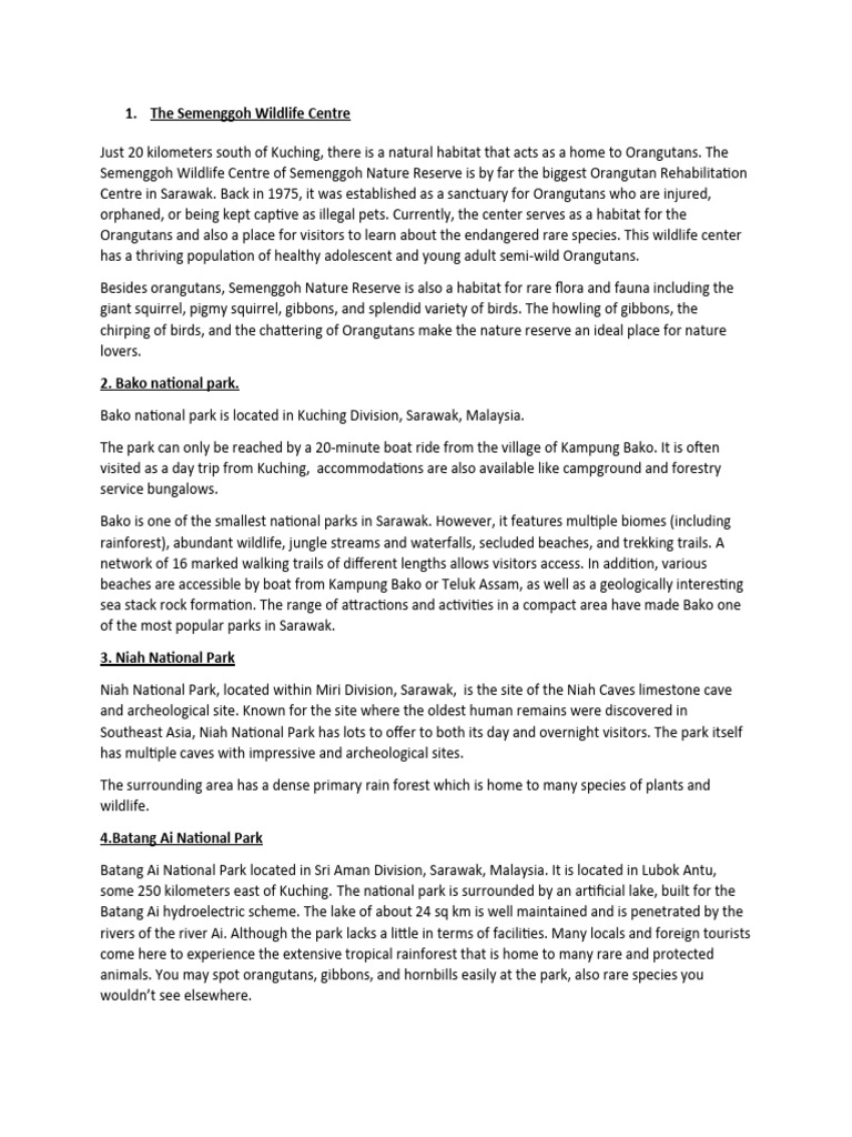 FIRST ONE IS The Semenggoh Wildlife Centre .THE SECOND IS 2. Bako national park. 3. Niah National