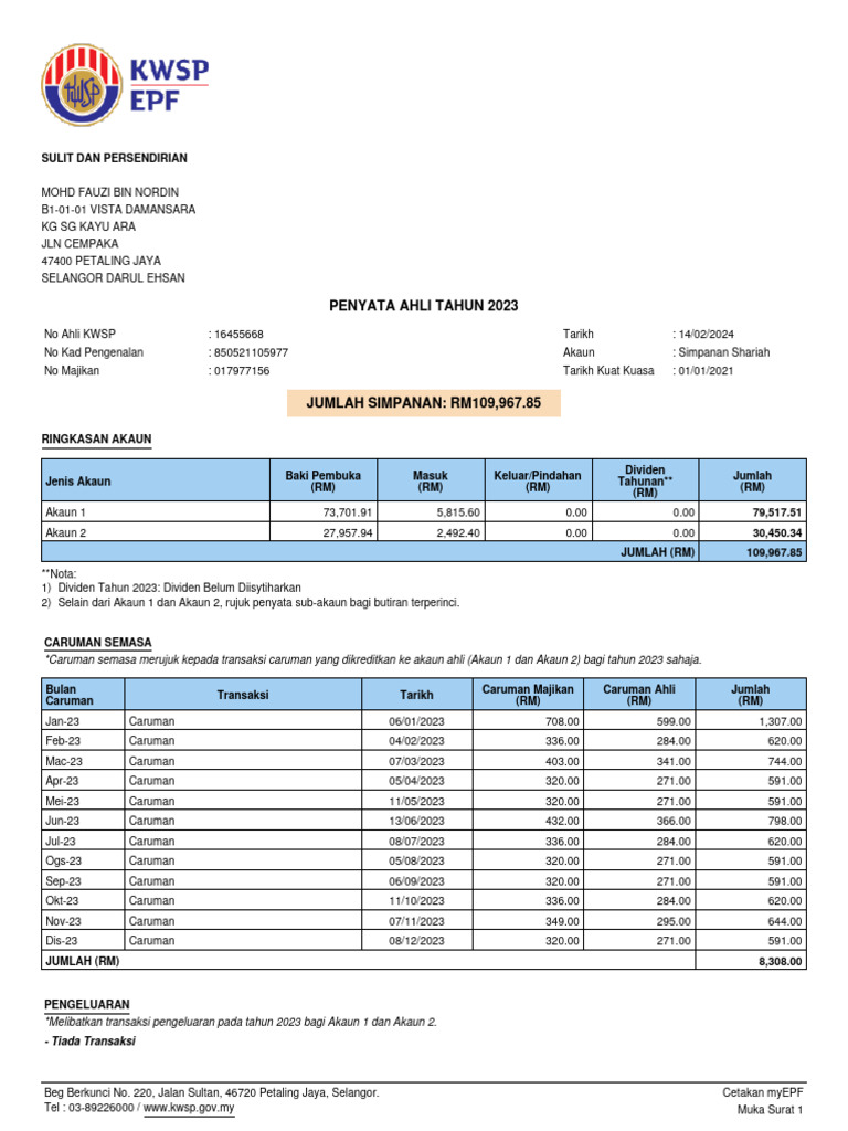 No Ahli KWSP : 16455668 Tarikh : 14/02/2024