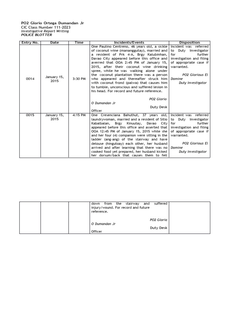 0015 January 15, 4:15 PM One Cresenciana Bahuthut, 37 years old, Incident was referred