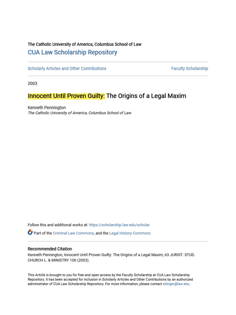 Kenneth Pennington, Innocent Until Proven Guilty: The Origins of a Legal Maxim, 63 JURIST: STUD.
