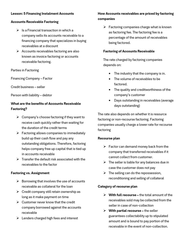 Lesson: 5 Financing Instalment Accounts How Accounts receivables are priced by factoring