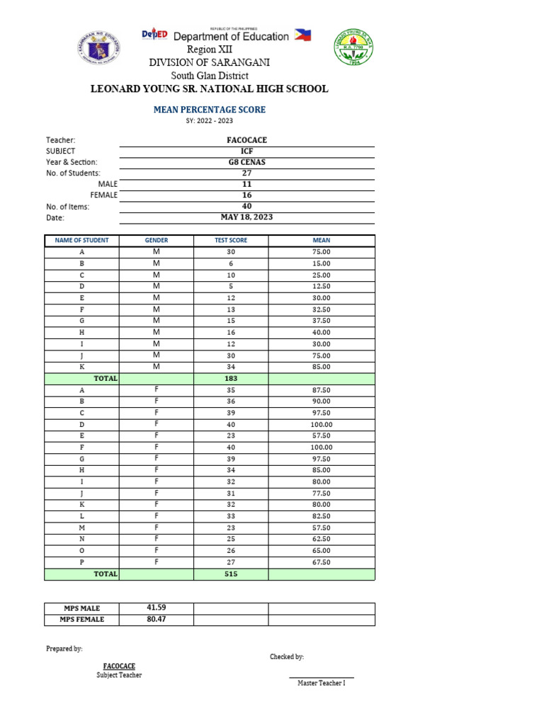 NAME OF STUDENT GENDER TEST SCORE MEAN