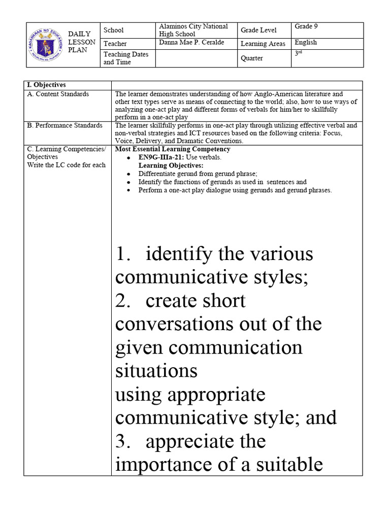 Objectives EN9G-IIIa-21: Use verbals.