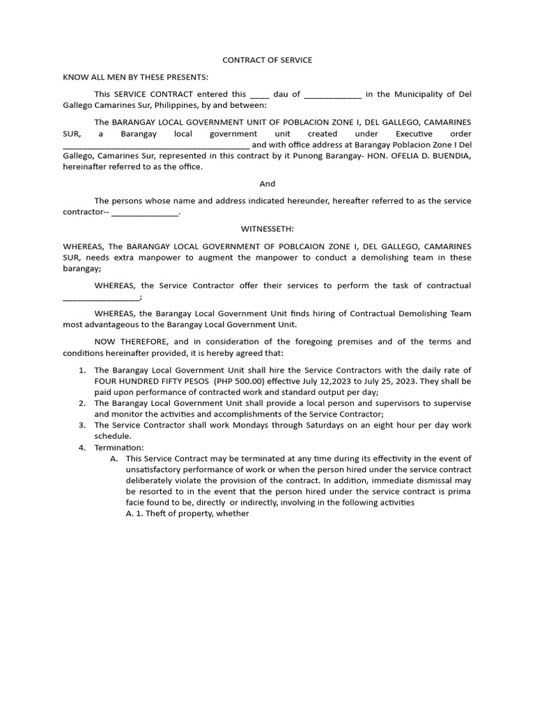 1. The Barangay Local Government Unit shall hire the Service Contractors with the daily rate of