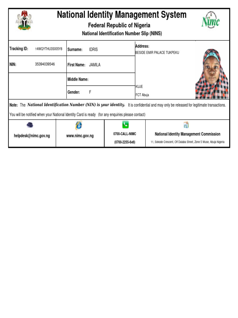 Note: The National Identification Number (NIN) is your identity. It is confidential and may only be released for legitimate transactions.