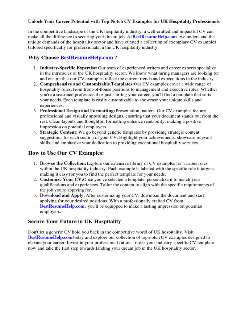 unique demands of the hospitality sector and have curated a collection of exemplary CV examples