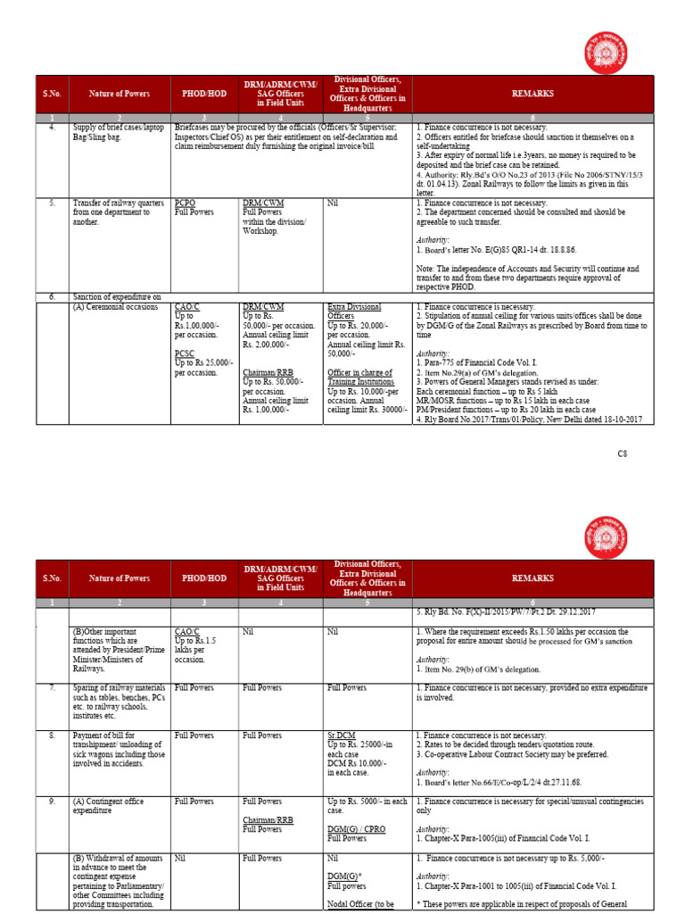 7. Sparing of railway materials Full Powers Full Powers Full Powers 1. Finance concurrence is not necessary, provided no extra expenditure