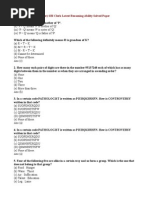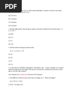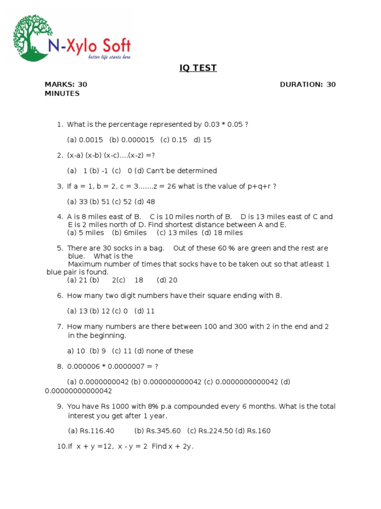 1. What is the percentage represented by 0.03 * 0.05 ? (a) 0.0015 (b) 0.000015 (c) 0.15 d) 15 2. (x-a) (x-b) (x-c)....(x-z) =? (a) 1 (b) -1 (c) 0 (d) Can't be determined 3. If a = 1, b = 2, c = 3.......z = 26 what is the value of p+q+r ? (a) 33 (b) 51 (c) 52 (d) 48 4. A is 8 miles east of B. C is 10 miles north of B. D is 13 miles east of C and E is 2 miles north of D. Find shortest distance between A and E. (a) 5 miles (b) 6miles (c) 13 miles (d) 18 miles 5. There are 30 socks in a bag. Out of these 60 % are green and the rest are blue. What is the Maximum number of times that socks have to be taken out so that atleast 1 blue pair is found. (a) 21 (b) 2(c) 18 (d) 20 6. How many two digit numbers have their square ending with 8. (a) 13 (b) 12 (c) 0 (d) 11 7. How many numbers are there between 100 and 300 with 2 in the end and 2 in the beginning. a) 10 (b) 9 (c) 11 (d) none of these 8. 0.000006 * 0.0000007 = ? (a) 0.0000000042 (b) 0.000000000042 (c) 0.0000000000042 (d) 0.00000000000042 9. You have Rs 1000 with 8% p.a compounded every 6 months. What is the total interest you get after 1 year. (a) Rs.116.40 (b) Rs.345.60 (c) Rs.224.50 (d) Rs.160