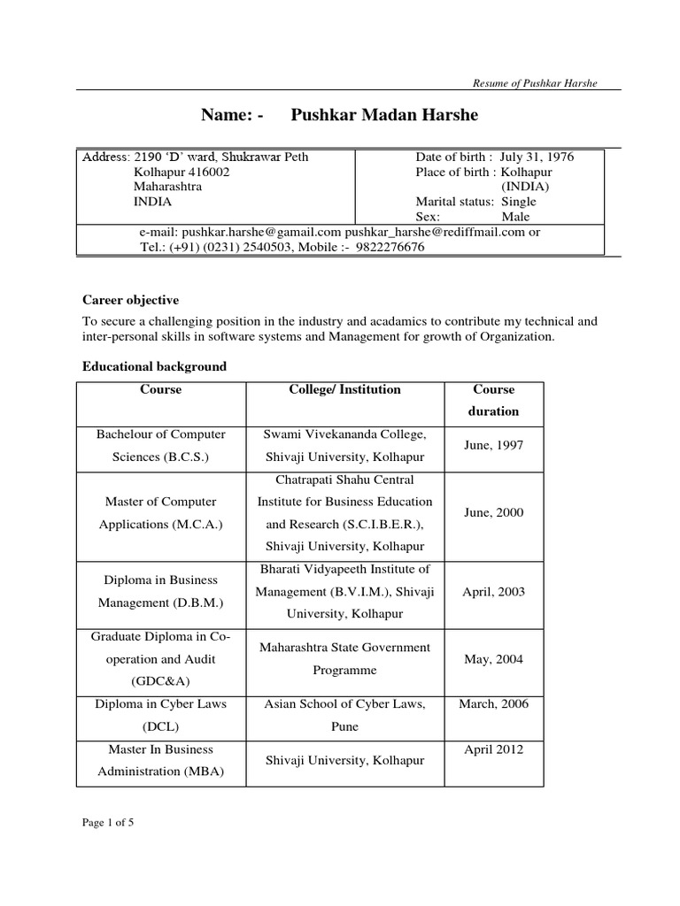 Address: 2190 ‘D’ ward, Shukrawar Peth Date of birth : July 31, 1976