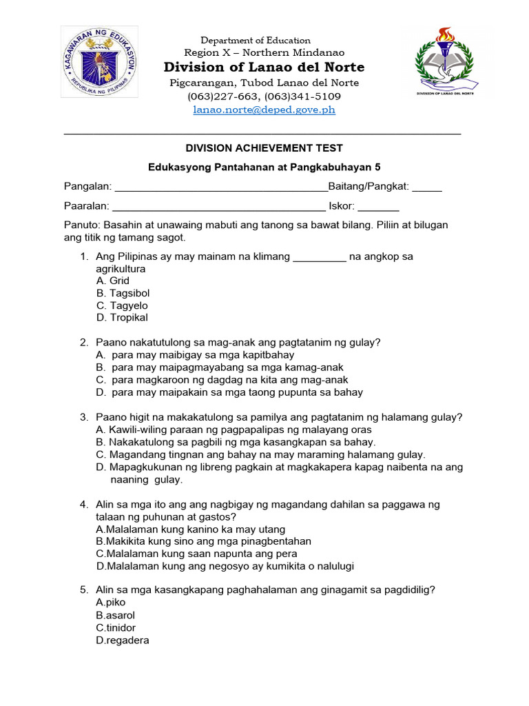 Panuto: Basahin at unawaing mabuti ang tanong sa bawat bilang. Piliin at bilugan