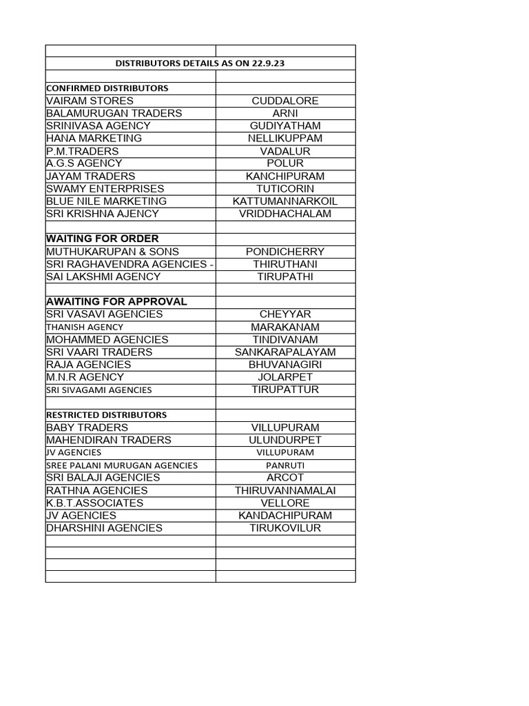 DISTRIBUTORS DETAILS AS ON 22.9.